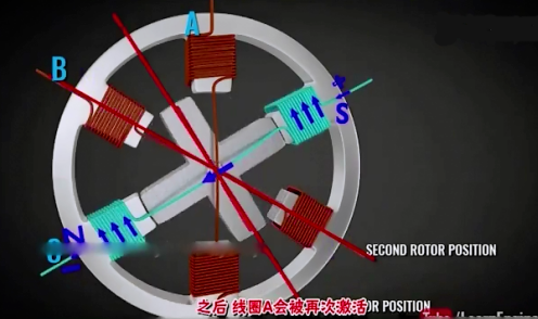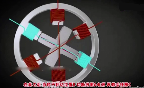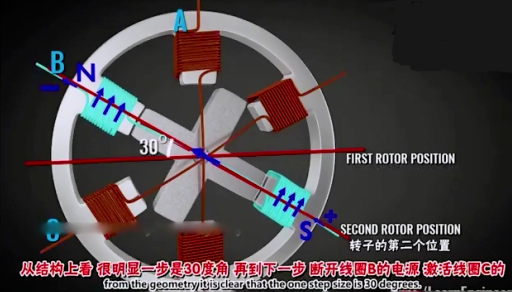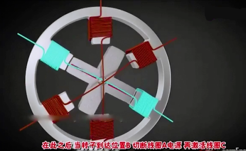 同理,當(dāng)B線圈斷電后,C線圈通電,那么轉(zhuǎn)子又會(huì)重新繞順時(shí)針轉(zhuǎn)30°。
