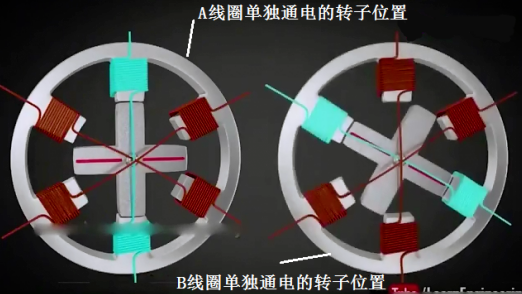 我們可以看到,初始位置A/B線圈通電時(shí),轉(zhuǎn)子狀態(tài)如下: