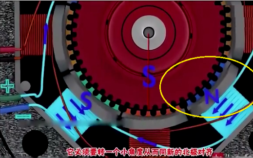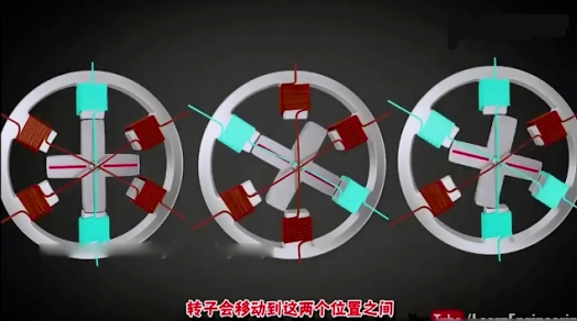 那么,下一次轉(zhuǎn)動(dòng)就是C線圈斷電,A線圈通電,轉(zhuǎn)子齒部重新與A線圈相合。重復(fù)四次后,轉(zhuǎn)子將轉(zhuǎn)動(dòng)一圈。轉(zhuǎn)子的轉(zhuǎn)動(dòng)是因?yàn)檗D(zhuǎn)子由金屬做成,在線圈通電后,轉(zhuǎn)子會(huì)找到最小磁阻的位置,那就會(huì)有一對(duì)轉(zhuǎn)子齒部與線圈相吸合。
