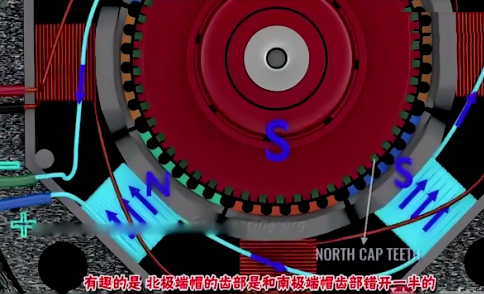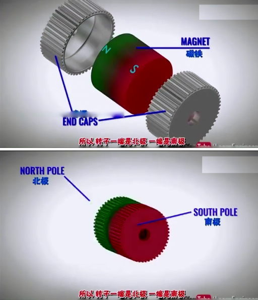 此電機(jī)的轉(zhuǎn)子由一個(gè)磁芯和兩個(gè)帽箍組成,具有南極和北極之分。