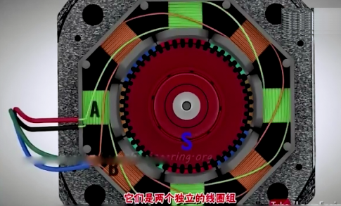 以下是在電機(jī)上的剖面圖,轉(zhuǎn)子正對(duì)你的那一面為南極,綠色是A線圈組,稱為A相,黃色為B線圈組,稱為B相,兩個(gè)線圈組是相對(duì)獨(dú)立的線圈組。