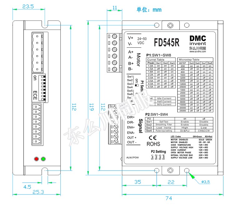 FD545R產(chǎn)品是東么川公司采用先進(jìn)的DSP控制芯片與獨(dú)特的控制電路結(jié)合一起所構(gòu)成的新一代智能數(shù)字式細(xì)分型步進(jìn)電機(jī)驅(qū)動(dòng)器,基于精密的PID電流控制算法設(shè)計(jì),高速大力矩輸出,靜止時(shí)動(dòng)態(tài)電流自動(dòng)減半,使電機(jī)溫度大為降低,最大限度發(fā)揮電機(jī)的性能,用戶可以設(shè)置1-128細(xì)分.低,中,高速運(yùn)行都非常平穩(wěn),幾乎沒有振動(dòng)和噪音,完全解決了步進(jìn)電機(jī)低速振動(dòng),和噪音的曲線,驅(qū)動(dòng)器內(nèi)部集成了參數(shù)自動(dòng)調(diào)整功能,能夠針對(duì)不同參數(shù)電機(jī)自動(dòng)生成最優(yōu)的運(yùn)行參數(shù)。